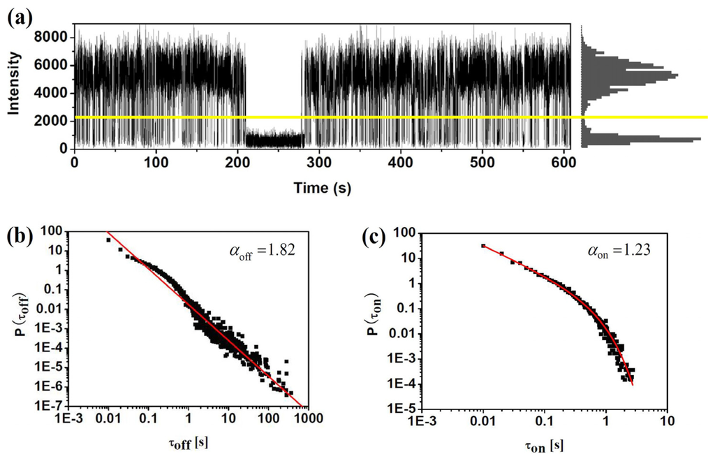 Based on the confocal or wide-field microscopy, blinking dynamics can be directly observed from the fluorescence trajectory of single molecules. Figure 3 demonstrates this procedure for a sample single molecule. The fluorescence intensity trajectory clearly shows two distinct intensity levels: one, at the level of 6,000 counts per second, indicates the “on” state of the molecule; the other, at the level of about 500 counts per second which is equal to the background, corresponds to the “off” state. Usually, a certain threshold (shown by the yellow line in Figure 3) is defined to identify the “on” and “off” states. To do that, background counts in the dark region of the sample (i.e., region with no fluorophores) were measured from which the average background level and its standard deviation σ were got. The threshold was defined typically at 2σ to 3σ higher than the average background level. Then we can go through the trace and generate the histogram of number of counts versus the duration of each “on” and “off” state. Basically, if the change between “on” and “off” state is dominated by a single ET event, the durations histogram follows a single exponential. One can get the average duration time by fitting the histogram with a single exponential curve. It is found that the ET rate of single ET events can be calculated with the average duration time of “on” and “off” states, which will be discussed in the following section of this review. Besides the single exponential distribution of duration times, a lot of experiments investigating blinking events found that the probability density of “on” and “off” duration times follow power-law on the log-log plots. Figure 3b,c show the probability densities of τoff and τon durations in log-log scale. Commonly, the “off” and “on” histogram has been found to be well characterized by a simple power law P(τon/off)=Aτon/off−α. However, a truncation of the power law has been found sometimes in the “on” duration, which can be well fitted by P(τon)=Aτon−αe−τoff/μ Such power law exponents α and μ are also critical factors characterizing the fluctuation dynamics surrounding the impurity molecules.