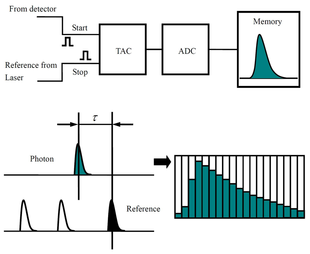 By using pulsed laser and time correlated single-photon counting (TCSPC), the fluorescence lifetime of single molecules can be constructed. Figure 4 shows the basic principle of TCSPC. In this case, the fluorescence signals detected by a single photon detector are converted into sequential pulses used as start signals of a time-to-amplitude converter (TAC). The reference pulses from the excitation pulsed laser source are used as the stop signals of TAC. As shown in Figure 4, the time delay between the arrival time of detected emission photon and excitation pulse is converted to an output voltage signal by TAC into the Analog-to-Digital Converter (ADC), where the decay curve for the excited state of the single molecule is reconstructed. The fluorescence lifetime of a single molecule can be achieved in this way by fitting the decay curve. It is established that fluorescence lifetime is determined as being inversely proportional to the sum of radiative rate constant kfluo and non-radiative rate constant knr, where knr includes all the non-radiative pathways which contribute to the de-excitation of the excited state: