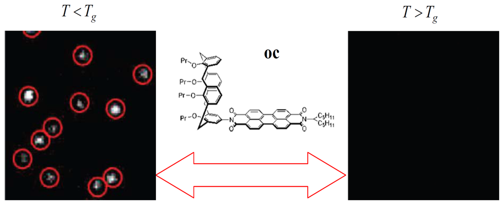 Recently, an elegant experiment was done by Siekierzycka et al. to probe the changes that occur when a poly(methylacrylate) (PMA) polymer is taken through its glass transition, based on an ET quenching mechanism [43]. In their work, a perylene bisimide chromophore was substituted with a calyx(4)arene unit to form a novel molecular system oc to probe polymer dynamics. It has been reported that the fluorescence of oc in toluene can be strongly quenched by ET from the electron-rich calyx(4)arene segment to the electron-poor perylene core [44]. Based on the fact that the driving force for ET processes in liquids should be smaller than in solids, it is reasonable that ET in oc is more efficient when the PMA polymer is in a supercooled liquid state than in a glass state. Figure 5 shows the images of oc molecules in PMA film as the temperature was changed above and below the Tg of the polymer. It reveals that the molecules on the same area of the sample are dark at increased temperatures above Tg, while the probes became ∼15 times brighter when decreasing the temperature below Tg. The fluorescence of probe molecules can be reversibly switched on and off many times by switching the polymer environment between supercooled liquid and glass states. This indicates that there exists more sufficient free volume for the molecule to reach the geometry of efficient ET in soft media than in rigid ones.