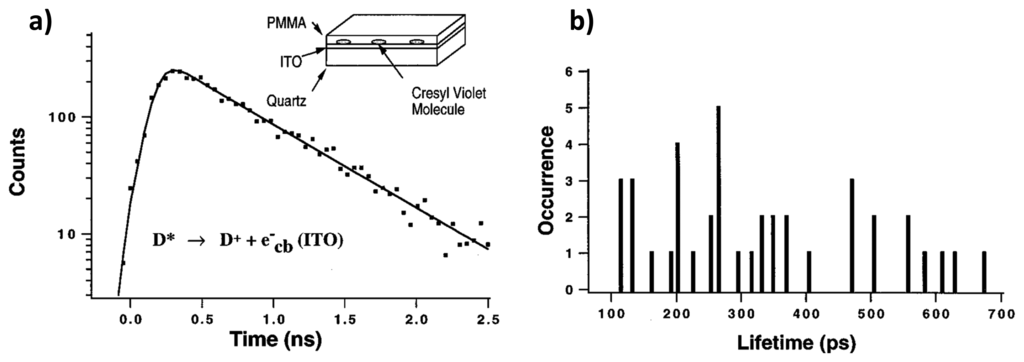 One of the methods concerning the interfacial ET between single molecules and semiconductors is based on the fluorescence lifetime detection. In the work of Lu and Xie [32], single-molecule chemical reaction kinetics on a fast time scale have been revealed by measuring interfacial ET between photoexcited cresyl violet molecules and the conduction band or energetically accessible surface electron states of indium tin oxide (ITO) semiconductors. The rate of chemical reactions in single-molecule measurements reveals the change of probability rather than the change of concentration on large ensembles of molecules. Figure 7a shows the single exponential fluorescence decay of a single cresyl violet molecule on ITO. Compared to the fluorescence lifetime of single molecules in an organic polymer in the 2.5–3 ns range, much shorter lifetimes in the 100–700 ps range were found for the molecules dispersed on ITO, as shown in Figure 7b. They attributed the fast decay to the interfacial ET from the photoexcited molecule into the conduction band of the semiconductor. It is also found that different molecules on the same ITO surface show a distribution of lifetimes, and this is attributed to the roughness of the ITO surface. It was proposed that ET rates were determined by electronic coupling between the excited state of the dye molecule and the conduction band of semiconductor, the driving force, and the solvent reorganization energy.