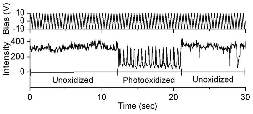 The electric field effects on the luminescence of single semiconductor nanocrystals [63–67] and single conjugated polymers [68–73] have been the subject of a significant amount of experimental studies during the past two decades. Park et al. studied the direct correlation of photobleaching and charge carrier effects of a conjugated polymer by applying an electric field to induce charge transport [69]. Fluorescence blinking of MEH-PPV has been attributed to efficient energy transfer to a reversibly formed, long-lived quencher site, involving some types of local photooxidation of MEH-PPV. Particularly, two characteristic effects have been found when an electric field was applied. For unphotooxidized MEH-PPV, fluorescence was quenched by positive bias. However, for photoxidized molecules an extraordinary repairing of photobleaching was observed when applying a negative bias, as shown in Figure 9. The results imply that the quenching is attributed to reversible ET between singlet excitons and injected holes.
