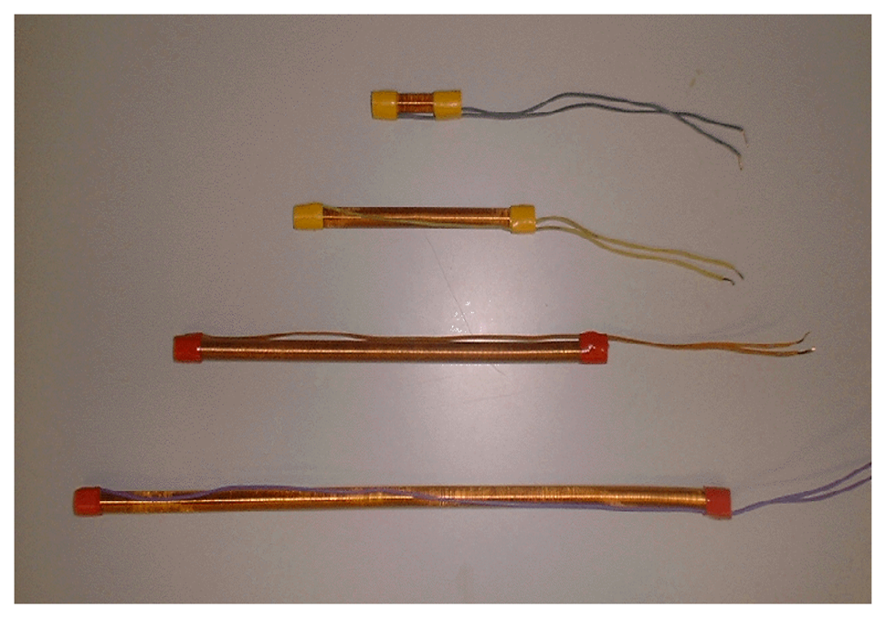 Figure 3 shows the built coils. All coils are wound over the same tubular base. There is only one layer of wound coil; different enameled copper wire has been used and different coil lengths have been obtained, but all coils have the same self-induction: 39.5 μH.