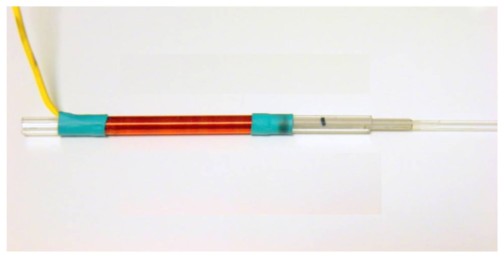 Two magnetic materials with different properties have been used as sliding ferromagnetic cores (Figure 4) to see how the transducer behaves with each of them. In one case a 3 mm diameter mild steel bar was used and in another case six sheets of an electrically isolated amorphous magnetic material (METGLAS 2705M, Metglas®, Inc., Conway, SC, USA) was used.