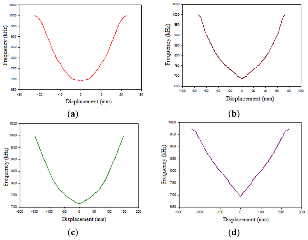 To obtain the range of the transducer, with both materials used for the nucleus, the frequencies with only the coil (without magnetic material inside) and when all magnetic nuclei are inserted inside them have been measured. The procedure was repeated for each of the four built coils. In Table 2 the frequency range (maximum frequency range of sensor response) and the frequency obtained for the four coils are shown.