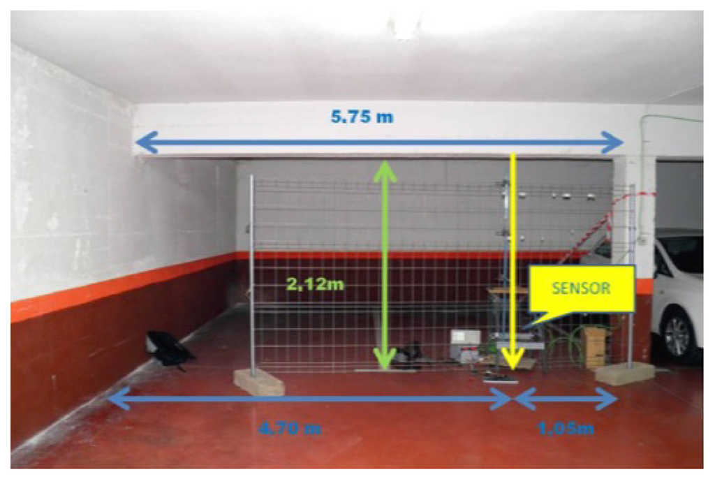 The sensor with 280 mm length coil was placed at 1.05 m from the column (Figure 6) to measure the vibration produced by the passage of cars in an underground parking garage.