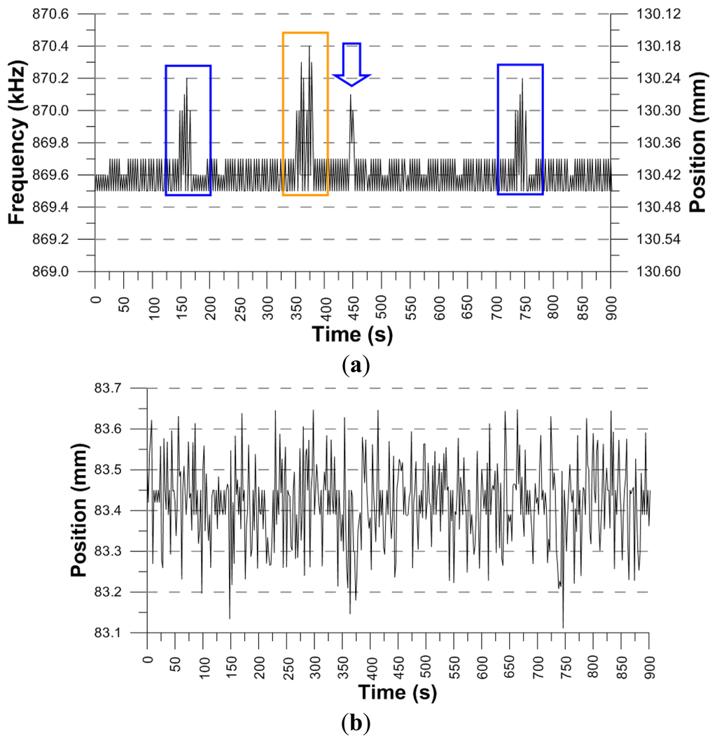 In Figure 7 the 280 mm length coil response can be seen. The data has been updated every 2 s. The areas marked with a box correspond to the parking garage. The marks in orange correspond to cars leaving the low floor parking garage and the marks in blue, to cars going out of upper floor parking garage. Within these areas the highest peak coincides with the closure of the parking door. Also, the areas marked with an arrow indicate traffic on the road outside just above the underground parking garage. The other relevant peaks, between 618 and 618.1 kHz for example, probably indicate the exits or entries from the street parking lot.