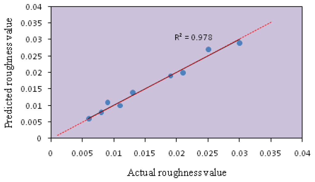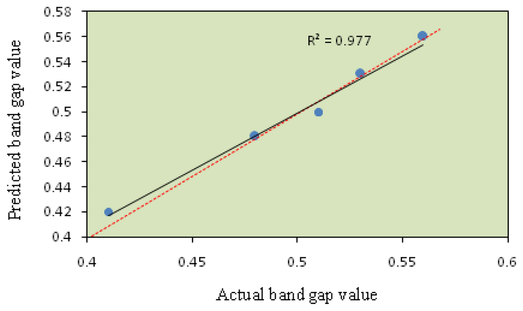 The model fitting technique showed sufficient correlation between the predicted values to the observed values. The fitting of the data to various models (i.e., linear, quadratic, two factorial and cubic) and their subsequent ANOVA showed that a quadratic response surface model was the most suitable to describe the synthesis of nanocrystalline SnO2. Figures 1 and 2 show the predicted values versus the actual values of the energy band gap and RMS roughness. The coefficients of determination (R2) obtained for the energy band gap and RMS were 0.978 and 0.977, respectively.