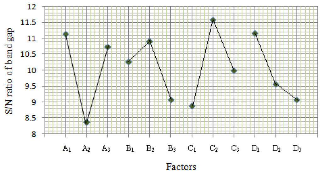 The Taguchi method is a statistical technique used in empirical studies. It is an conomical way to characterize complicated processes, and it requires fewer experiments to optimize reactions. In the methodology, a factorial design was used for experimental design and fitting the performed results with a polynomial equation in the vicinity of the optimum conditions to make a model [13]. The model relates the responses and the variables of the deposition process [14]. Therefore, in this work the optimum conditions were simulated by the TOA and then visualized by 3D plots in vicinity of the reported optimum conditions [15]. The predicted optima of the responses and the variables were the confirmed by the actual responses from laboratory experiments.