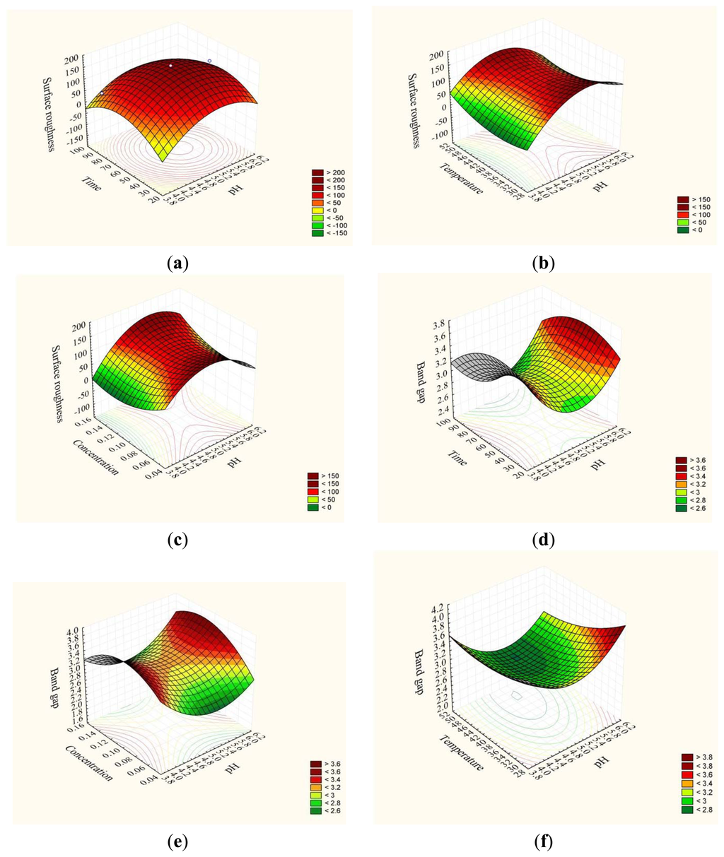 Figure 5f shows the interaction between pH and temperature with constant concentration and time (0.1 M and 60 min). As observed, an acceptable energy band gap was obtained at lower temperatures. Any increase in the temperature resulted in a diminished energy band gap.