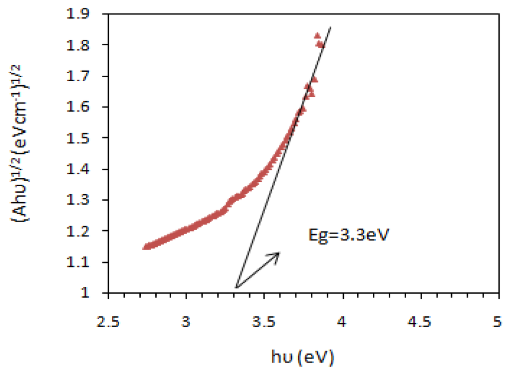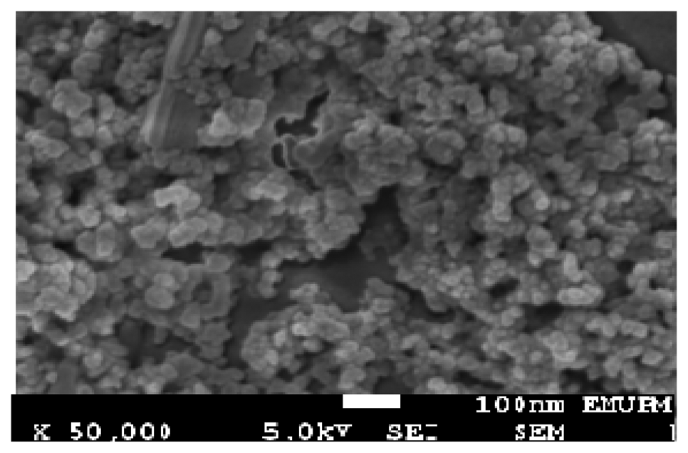 Once the optimum level of the design parameters had been selected, the final step was to predict and verify the improvement of the quality characteristic using the optimum level of the design parameters. Figures 6 and 7 show the surface morphology and energy band gap of nanocrystalline SnO2 thin film at the optimum conditions predicted by TOA. As observed, the experimental values were reasonably close to the simulated values, which indicated the high validity and adequacy of the model. The grain size of the deposited SnO2 film under the optimum conditions according to SEM observation was about 45 nm.