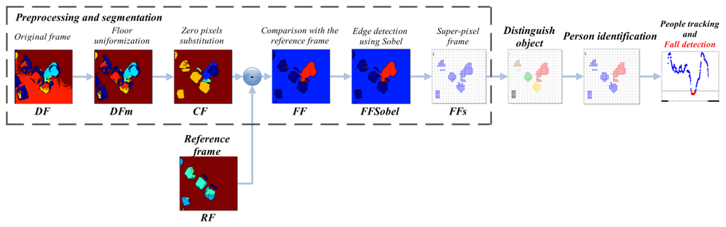 The entire procedure is illustrated in Figure 1, where each step described above can be identified. It might also be noted that the preprocessing and segmentation part is detailed with the outputs of every sub-step. The paper is organized as follows: Section 2 provides an overview of related work about automatic fall detection using depth frames. Section 3 describes the implementation details of the proposed system, while Section 4 underlines the performances achieved by the proposed approach. Finally, Section 5 summarizes the conclusions of the work.