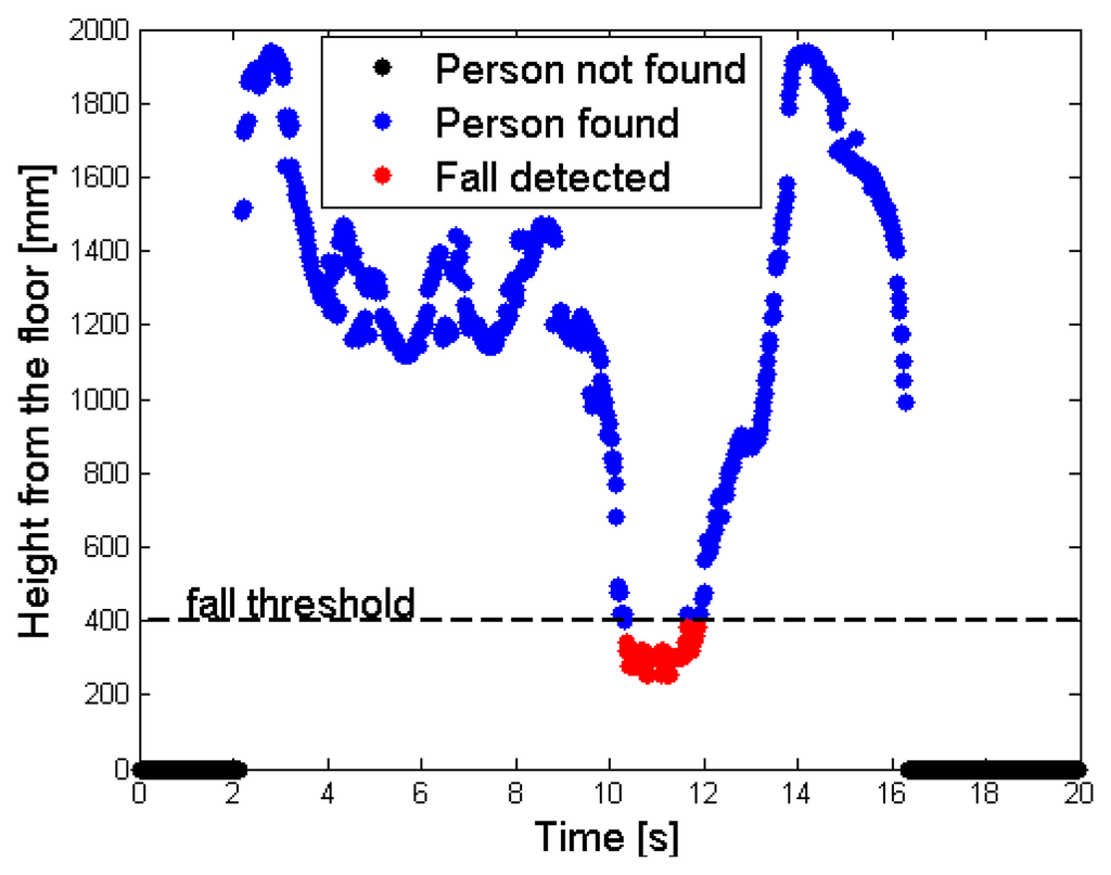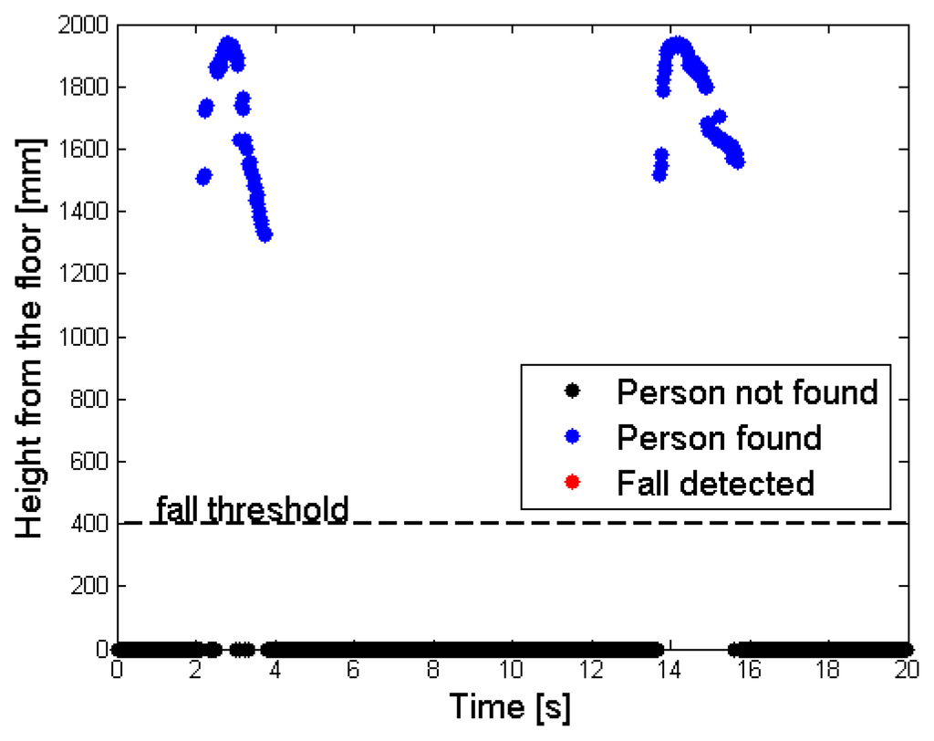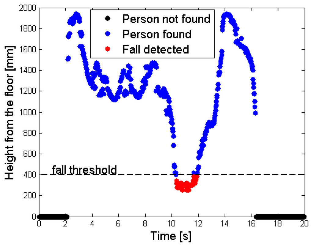 The tracking phase starts as soon as the person is recognized (blue spots); the central point moves from the shoulders to the head, while the subject is approaching the center of the scene. This movement is visible in the time interval [,] s, as an increasing height from the floor value. After this time interval, the fall event takes place, and the height values in the graph drop down. When the height value detected undergoes the 400 mm threshold, the system triggers an alarm and the fall event is notified (red spots). In the test, the subject lies on the floor for about 2 s, then gets up and moves away from the area monitored by the sensor. The decreasing of the height from the floor value, that occurs before the person exits the area monitored by the sensor at time instant 16 s, is also due to the shift of the central point position inside the human subject's shape.