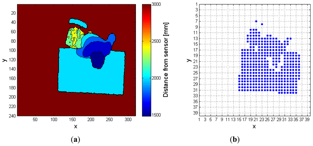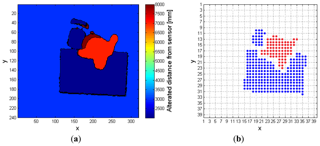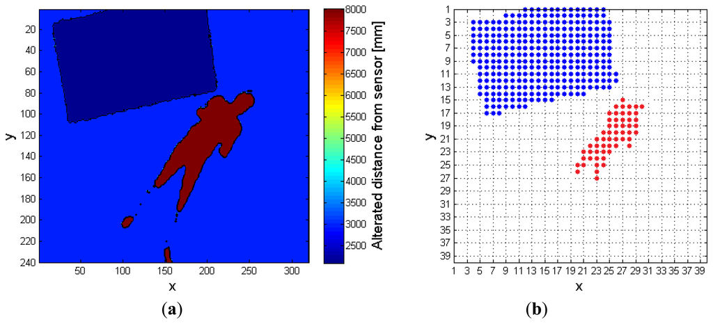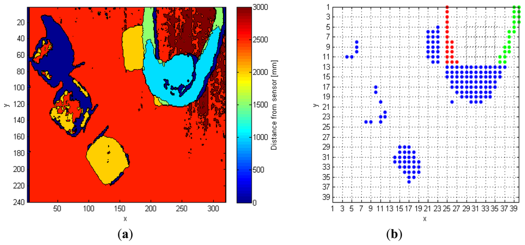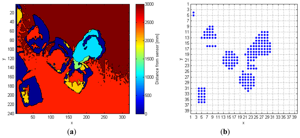 The last operation consists in the creation of a so-called 40 × 40 super-pixel frame (FFs): each super-pixel corresponds to a 6 × 8 block of pixels in FFSobel. The i-th super-pixel takes the value 1, if all the pixels in the block differ from MaxHeight, otherwise it takes the value 0. This process improves the separation between each object in the scene, and also allows the processing time to decrease because the total amount of pixels passed to the following steps is reduced, as shown in Figure 2b.