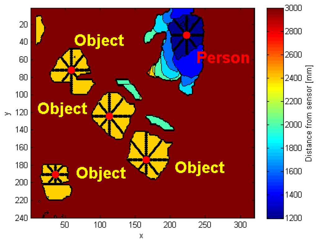 The function IsPerson takes as an input the mpi coordinates information, and recognizes if that blob belongs to a person or not. The research method, implemented by IsPerson, exploits the anthropometric relations that characterize the human body []. For each object, the features evaluated starting from the mpi point are: