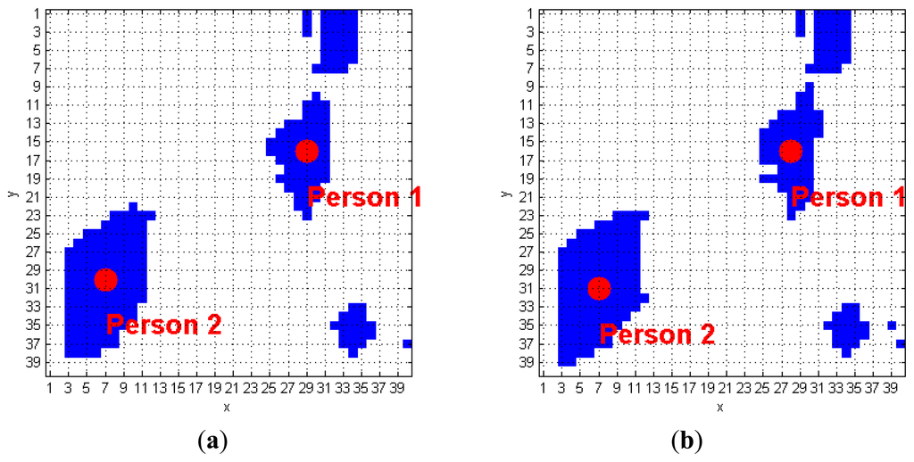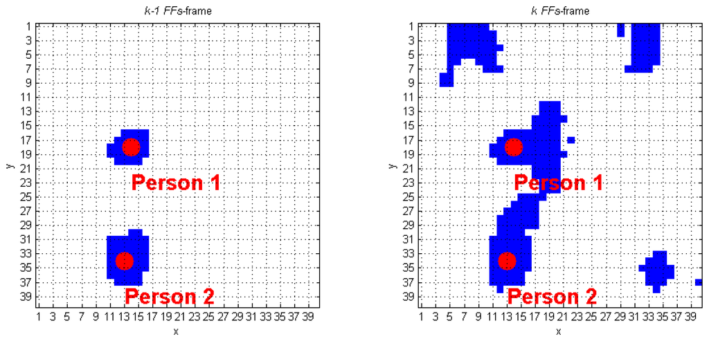 The algorithm we developed to track human subjects from the captured depth frames starts by placing the person position (scpPer), computed over the (k−1)-th FF frame, inside the k-th FF frame. The blob that contains this point is automatically associated to a human target. Figure 6 shows a simple application of this approach: it the (k−1)-th FF frame, the scpPer point of the human target labeled as 1 is positioned in (29, 16), and, at the k-th FFs-frame, that point is again inside the same blob. The next step requires updating the scpPer coordinates, according with the procedure described at the beginning of Section 3.3. The result, again for blob 1 of the previous example, is (28, 16), as shown in Figure 6. The same operation is applied on the blob labeled as 2, thus passing from the coordinates (7, 30) to (7, 31). When more human subjects are close together, they may be included in the same blob. These situations may occur due to partial superimposition of silhouettes, as in a shoulders contact. The fusion effect occurs because the people's shoulders may take very similar height values, and the Sobel algorithm fails. Figure 7 evidences this phenomenon; in detail, the two human subjects correctly recognized in the (k−1)-th FF frame, get merged into the same blob, labeled as 3, in the k-th FF frame.