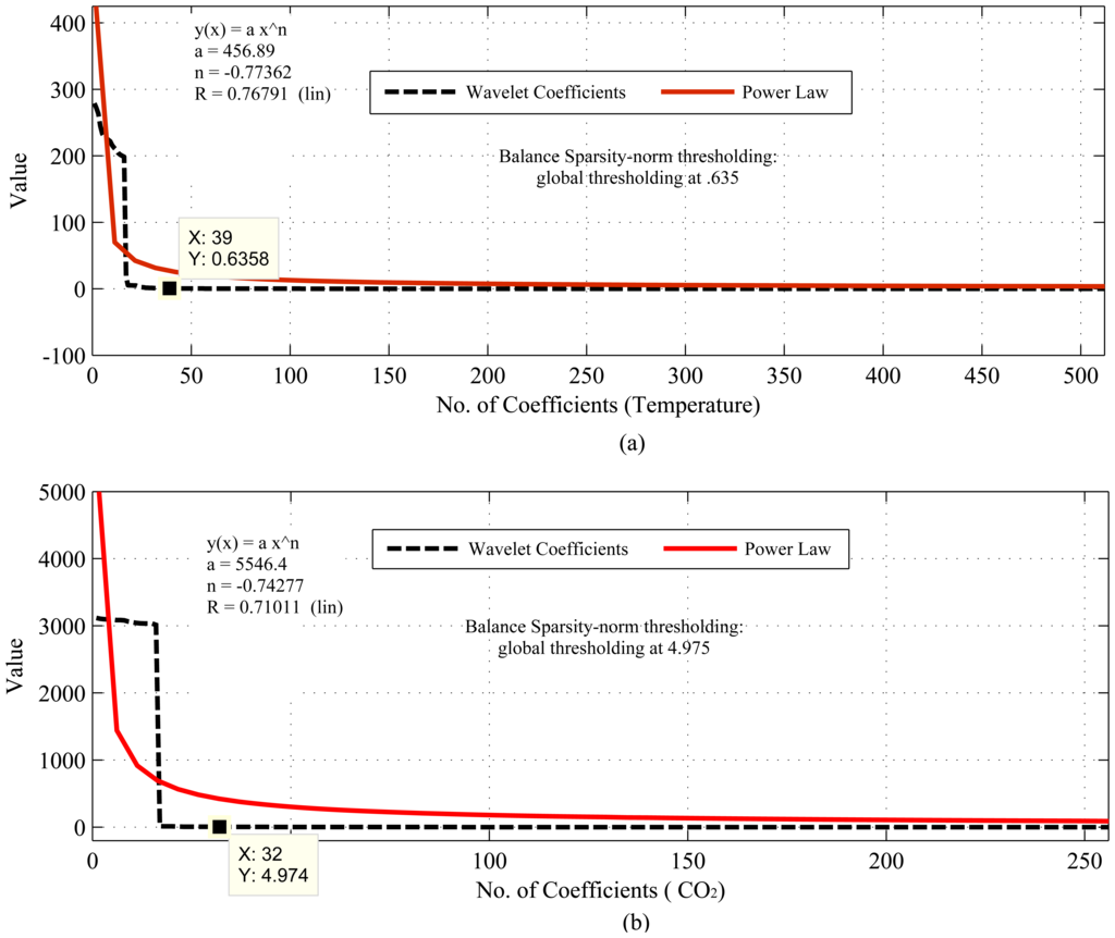 As shown in Figures 1, 2 and 3, the considered temporally correlated temperature, seismic signal and CO2 and spatially correlated temperature signals are compressible as their discrete wavelet transform (DWT) analysis shows that the number of significant wavelet coefficients are very limited. It is clear from these figures that the sparsity levels of the datasets are diverse. For instance, the approximate number of significant coefficients (using balanced sparsity-norm thresholding) for temporally correlated temperature and CO2 are 39 (out of 2,048 in the figure, only 512 are shown) and 32 (out of 1,024 in figure, only 256 are shown), respectively, and for spatially correlated temperature it is eight (out of 64). On the other hand, using the same transform and thresholding, the approximate number of significant coefficients for a temporally correlated seismic wave are 49 (out of 1,024) and 177 (2,048), which are reasonably higher than the other two datasets. These are the values of K for the respective signals. Most importantly, these datasets are highly compressible, as their sorted (descending order) wavelet coefficients have good fit with the power law (shown in Figures 1 and 3), hence strongly satisfy the compressibility condition [13]. Even though all the datasets are compressible using CS/DCS, the compressibility of seismic wave might not be that significant. For instance, according to “four-to-one” [12], M = 4K for 2,048 samples (N) M = 4 * 177 = 708, which means M is almost comparable to N. One of the reasons for this could be the choice of transform or representation basis. The wavelet-based transforms are more suitable for piecewise constant data [26,88], but may not be for frequently variable seismic waves.