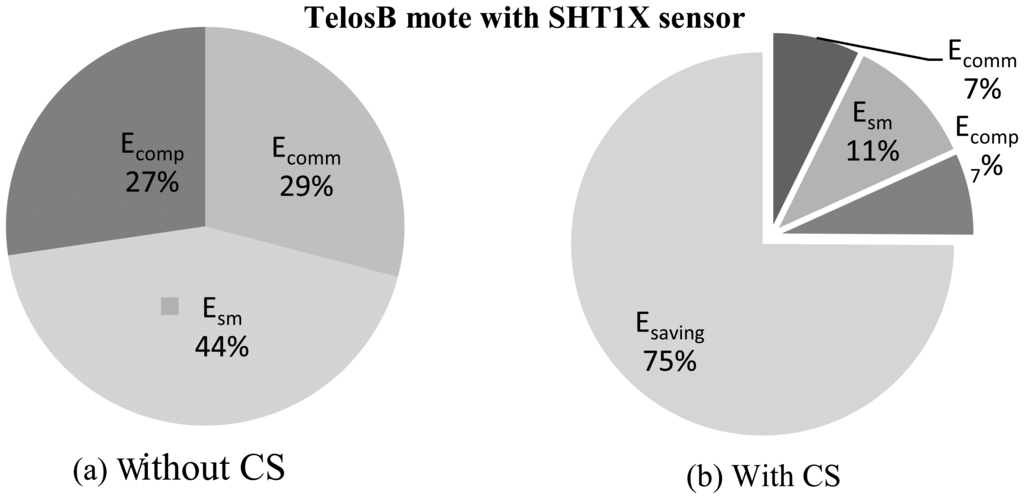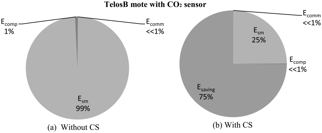 Figures 9 and 10 present comparison snapshots of Ecomm, Esm and Ecomp, normalized by Ecomm for temperature and CO2 sensors when attached to a TelosB mote [65] for N = 1,024 and M = 256 and N = 512 and M = 128, respectively. In summary, these figures and the Table 4, along with Figures 4, 5, 7 and 8, show the potential of CS and DCS in saving sensing and overall energy costs in WSNs. These benefits are coming at the cost of increased complexity at the sink and increased delay. This delay can be problematic in real-time WSN applications.