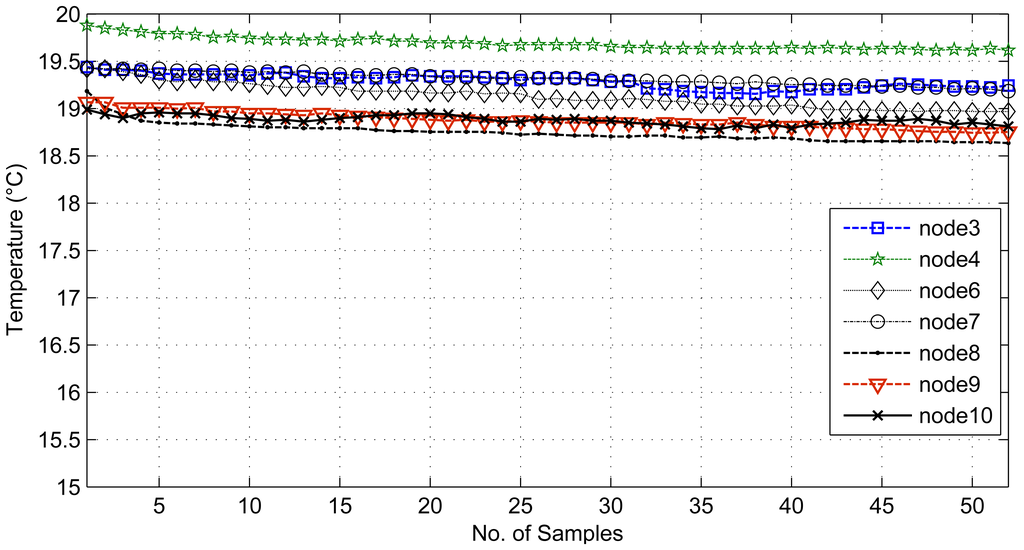 For the comparative study, we present two sets of results. The first set provides results for temporally correlated signals, where we compare CS, transform coding (TC), predictive coding with uniform sampling (PC-US) and adaptive sampling (PC-AS), and the second set for spatially correlated signals, where we compare DCS with TC and ASAP [36]. These results are mainly in terms of reconstruction performance and energy savings. Each set of results includes the performance for regular monitoring and event detection signal reconstructions. For spatially correlated sensor readings, we considered a clustered WSN and applied the schemes at the cluster level. It is quite evident from Figure 11 that the sensor readings of nodes 3, 4, 6, 7, 8, 9 and 10 are strongly correlated with the average correlation coefficient = +0.86. Therefore, similar to [36], we are assuming a correlation-based clustered WSN. In Figure 11, the thick dotted and continuous lines mark two clusters of size 8, and together, these two make a cluster of size 16. Figure 12 shows a snapshot of the spatial correlation amongst the nodes in cluster 1 of Figure 11.