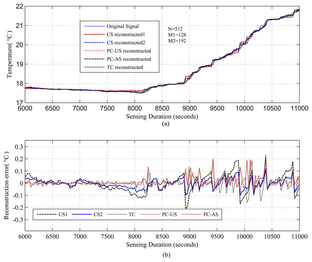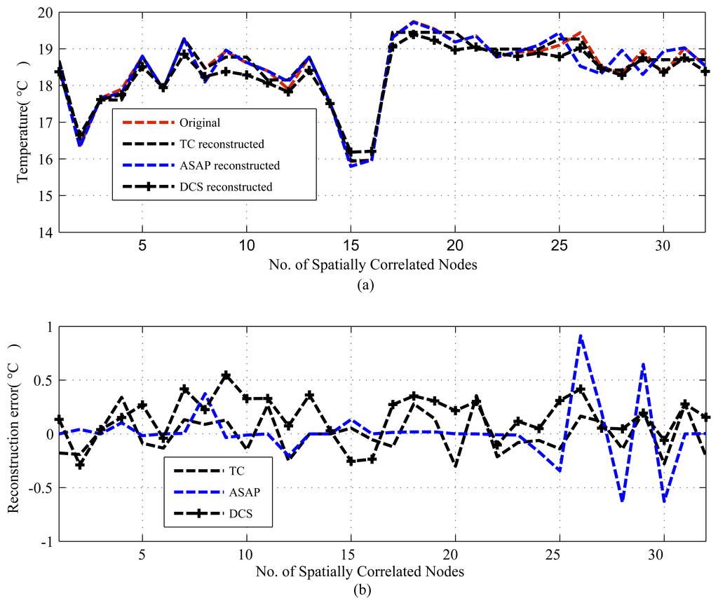 This section evaluates the effectiveness of CS/DCS as an energy-efficient sensing in WSNs using the algorithms introduced in the previous section. It also includes the overall energy savings of CS/DCS in WSNs. For the evaluation, a numerical experiment has been used. Two comparative studies have been conducted for two different types of signals to show the potential of CS/DCS in comparison to its counterparts, including the down sampling method [35,36]. For temporally correlated signals, a comparison was made between CS, transform coding (TC) and adaptive sampling-based predictive coding (PC). For spatially correlated signals, it was between DCS, TC and ASAP (adaptive sampling approach) [36]. Adaptive sampling-based predictive coding (PC) and ASAP are the two down sampling methods in the study. DCS implementation has considered a clustered WSN and assumed that clusters are formed based on the spatial correlation.