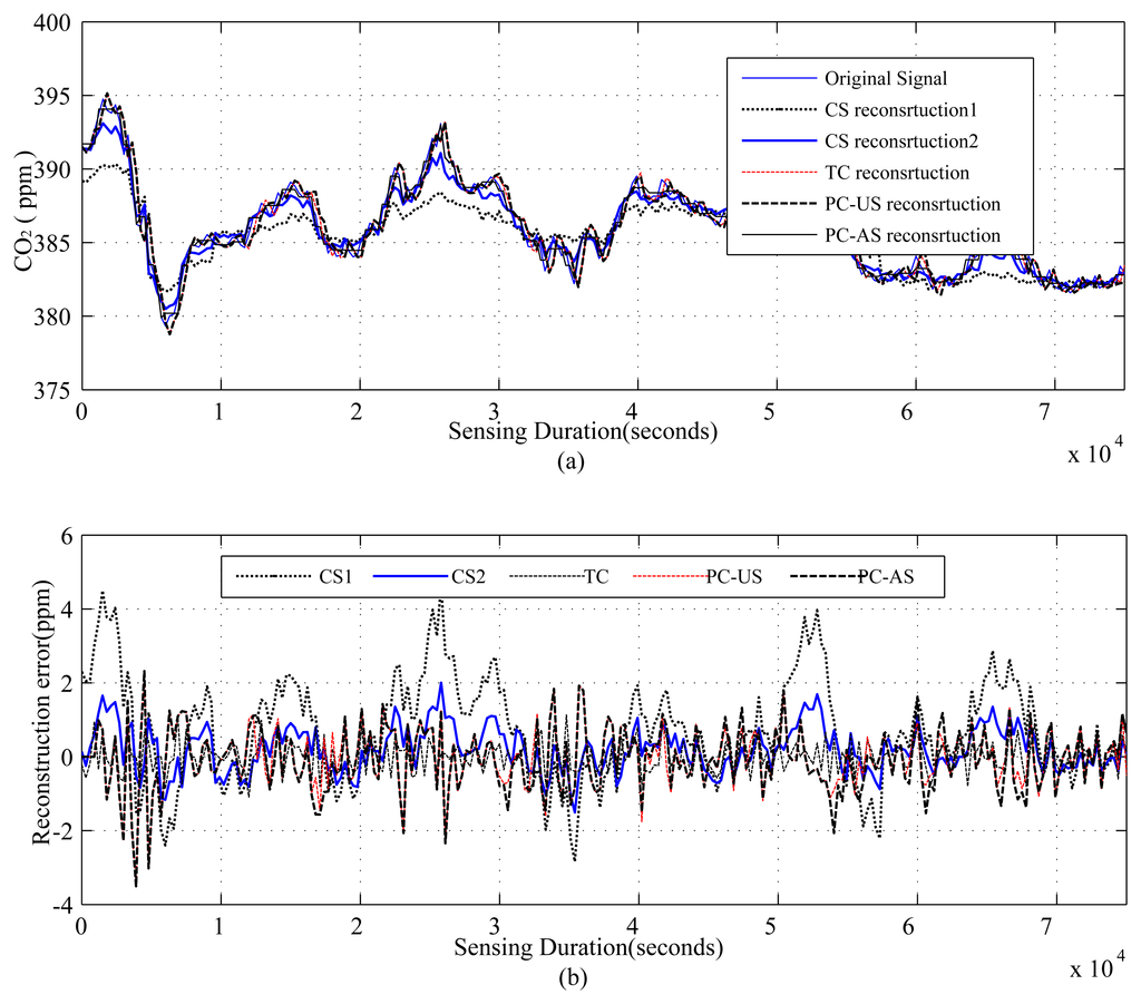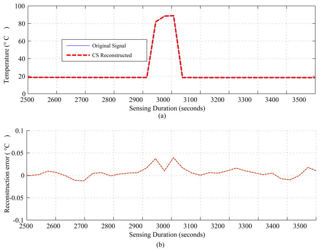 The results are presented in three parts. The first part presents the sparsity of the datasets used and the potential of CS/DCS as energy-efficient sampling in WSNs. The second part quantifies the amount of savings, due to CS/DCS in sensing, and the overall energy costs of WSNs. The third and final part presents the comparative study. In all three parts, we used sensing energy cost savings, overall energy cost savings, absolute mean reconstruction error (Rmean) and root mean-squared error (RMSE) as performance analysis parameters. Typical WSN applications fall into two categories: periodic monitoring and event detection. Hence, in the experiments, we did the analysis for both. For the results calculation, we ran each experiment 100 times and calculated the average. Every figure of the evaluation section contains two parts: (a) showing signal reconstructions; and (b) showing residual errors for the corresponding reconstructions.
