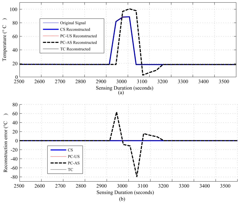 Based on the results, tables and using information from [7], we summarize the results in Table 7. It is quite evident from this table and the above discussion that CS and DCS have the potential to sense energy efficiently and save overall energy costs. They can even can outperform most of their counterparts, especially down sampling methods, like PC-AS, ASAP, etc. However, delay can be an issue in real-time applications and in large-scale WSNs, and a lack of sparsity can be a problem in small WSNs. TC and PC-US perform less well than CS/DCS, PC-AS and ASAP, as they do not support sensing-level compression. For this reason, in power hungry sensors, e.g., CO2 sensors, communication and computational energy cost savings are almost nullified by high sensing costs. Due to the cost of model update and re-training, PC-US, PC-AS and ASAP might performs poorly in dynamic networks and environments where frequent updates are necessary. Hence, PC-AS and ASAP may fail to detect events (Figure 18). Moreover, ASAP performance depends on so many parameters [36] that it is hard to optimize and generalize for groups of applications.