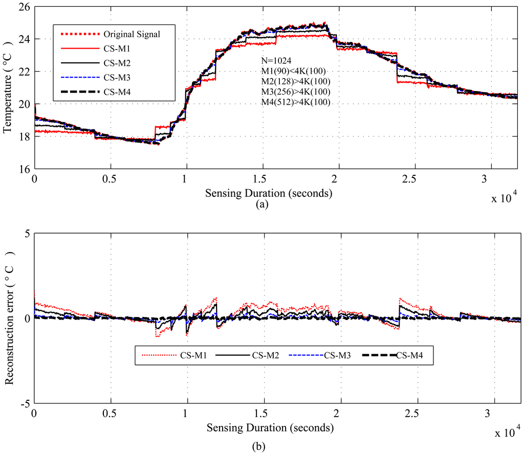 Figures 4, 5 and 6 show the results for regular monitoring applications. Figure 7 presents the result of event detection using CS for a temporally correlated (temperature) signal. It is clear from the figure that CS has the potential to detect event (e.g., abrupt changes in temperature readings, which are available in dataset one) in a temporal signal with high accuracy (very low reconstruction error) and significant sensing compression (e.g., 50% for the figure where N = 1, 024 and M = 512).