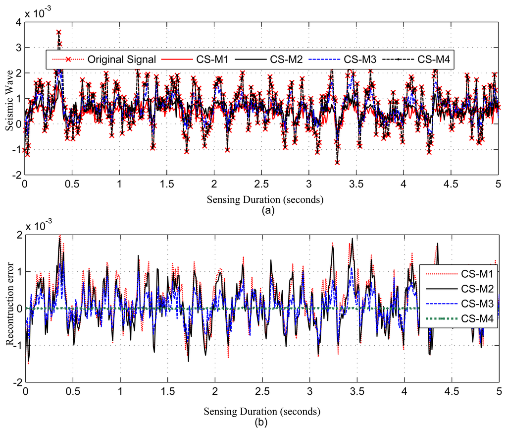 Figures 4, 5, 6, 7 and 8, present the results for signal reconstruction along with Rmean (we have chosen M = 4K). Each figure presents the reconstruction result of a fixed N with four values of M, which are marked as CS-M1, CS-M2, CS-M3 and CS-M4. For temperature, the values of M were M1 = 90, M2 = 128, M3 = 256 and M4 = 512, for a seismic wave M1 = 256, M2 = 512, M3 = 768 and for CO2 M1 = 80, M2 = 128, M3 = 256 and M4 = 384. As shown in Figure 4, for the temporally correlated temperature data with samples N = 1,024 and M1 = 90, reconstruction slightly suffers with Rmean = 0.39 and Rmax = 1.63 > 0.5°C [56] as M1(90) < 4K(100), where 4K is the standard required sample for satisfactory reconstruction. For the values of M close to 4K or higher, CS reconstruction perform satisfactorily as their Rmean < 0.5 °C [56]. For instance, for M1 = 128, CS shows reasonably good performance with RMSE = 0.0173 with tolerable absolute residual mean (Rmean) 0.23 °C, which is lower than the sensor tolerance, 0.5 °C [56]. As shown in Figure 4b, the reconstruction error or residual errors reduce progressively as M moves from lower to higher values. For example, in the case of M2 = 128, Rmean = 0.23, and for M3 = 256, it is 0.082. Figure 5 presents the results for a temporally correlated CO2 signal with N = 512. Performance-wise, it shows similar trends as for Figure 4. For M1(80) < 4K (88), CS slightly suffers, with Rmean = 1.71 and Rmax = 7.8, and for M2(128), M3(256) and M4(384), it shows satisfactory results for CO2 data, as their Rmean values (e.g., 1.14, 0.49, 0.19) for all M are significantly lower than the typical CO2 sensor tolerance (e.g., ±40) [9]. This is because M(128/256/384) > 4K(88) [9]. Figure 6 presents the results for a temporally correlated seismic signal with N = 1,024. Although with increased M, it shows similar trends as for Figures 4 and 5, it suffers in terms of reconstruction quality, especially in terms of Rmean and RMSE. For instance, for M = 256, Rmean = 0.00055, comparable to the mean signal value, 0.0095, and RMSE = 0.72, which is really high compared to the other datasets. With the increased M for fixed N, both parameters improve with the reduced compression, but still suffer compared to the other datasets. This could be due to the inappropriate choice of the transform basis, as the used wavelet basis is good for piecewise constant data and may not be good for seismic wave-like continuously varying signals. This result shows the importance of the selection of an appropriate basis or transform, which is an important issue in CS/DCS.