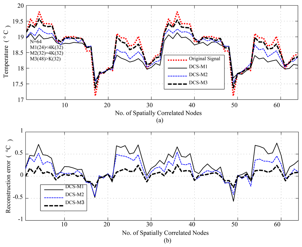 Figure 8 presents the reconstruction result for spatially correlated signals for N = 64 where K = 8. As shown, for a lower value of measurements M1(24) < 4K(32) for N = 64, DCS reconstruction is poor, even in the case of M2(32) = 4K(32), due to a lower value of N. This is because CS/DCS has a scalability problem for lower values of N. On the other hand, M2 = 48 shows low Rmean (0.093), but comes at the cost of reduced SR (1.34) compared to SR (2) for M2. It is evident from Figures 4, 5 and 6, 8, for values of M close to 4K or higher, CS reconstruction performs well for temporally and spatially correlated signals by providing SR > 1, hence sensing energy cost savings. Higher values of M progressively improve the reconstruction quality of CS/DCS, but higher values of M may be comparable to N and can diminish the advantages of CS/DCS.