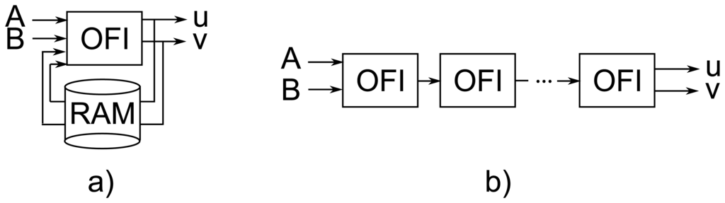 It can be noticed (Table 1) that all previous hardware implementations of the Horn-Schunck algorithm use the iterative approach presented in Figure 1a. In this solution only one module for computing the iterative Equations (2) and (3) is used. The temporary optical flow vectors between iterations are stored in a RAM memory (either internal or external). Such architecture strongly limits the possible parallelization and significantly reduces the overall performance of the system. Using external RAM memories also limits the maximum data transmission rate and using internal RAM of FPGA devices (mainly Block RAM) limits the maximum image size which can be processed. This is why previous implementations supports only images of up to 320 × 240 pixels and achieve rather low throughput.