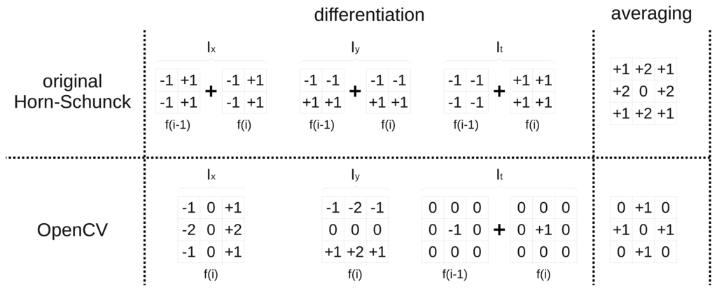 In Figure 10 the original kernel masks proposed in the work of Horn-Schunck [12], as well as kernels used in the OpenCV implementation are presented. In the first algorithm a sum of two convolutions with a 2 × 2 kernel mask executed on previous and current frame is used for derivatives computation. For averaging a 3 × 3 kernel is used, which requires multiplication and addition of 8 values. The sum of kernel mask parameters equals 12 (not a power of two), so the normalization requires an additional division operation.