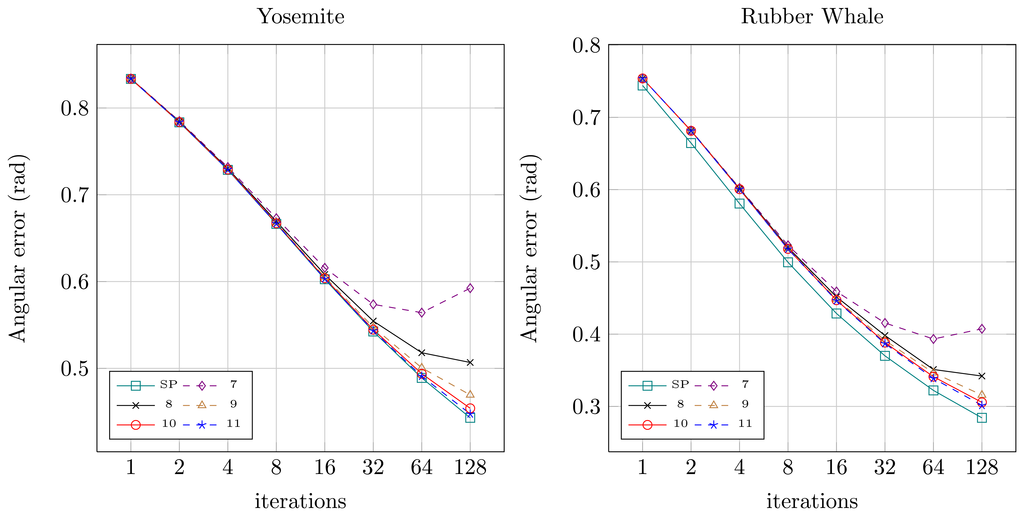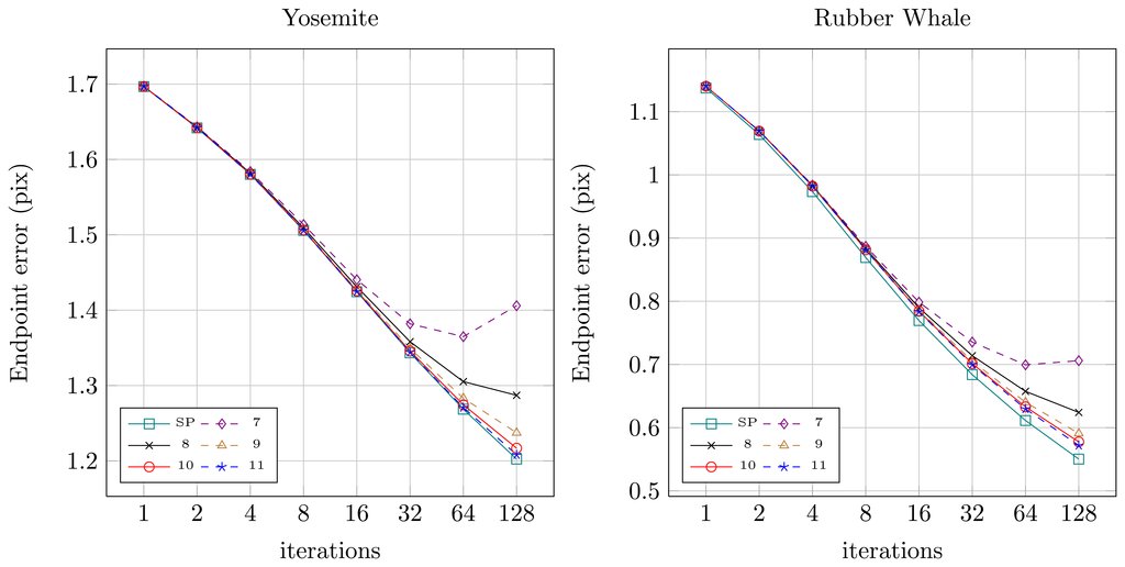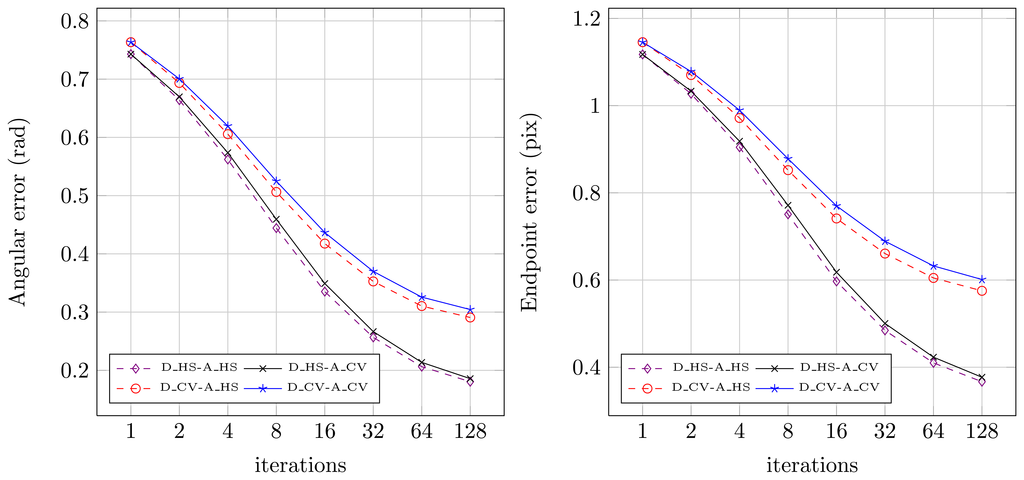 Before starting the quantitative assessment, the values of α parameter used in Equations (2) and (3) should be determined. To achieve that the original Horn-Schunck optical flow algorithm from OpenCV library was executed many times with different number of iterations and α parameter value. The found α values, which minimize the average endpoint error for a given iteration number in each sequence were used in further research.