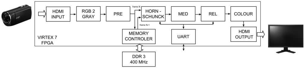 The HDMI source (e.g., a digital camera) is connected by specialised extension card Avnet DVI I/O FMC (FPGA Mezzanine Card) to the FPGA device logic (HDMI INPUT). The received colour video stream is converted to greyscale (RGB 2 GREY) and transferred to the pre-filtering module (PRE). In the next step, it is split and directed to the memory controller (RAM CTRL) and HORN-SCHUNCK module. Because the optical flow module needs two images: previous and current (frames N-1 and N), the current frame is stored in RAM memory. As a Full HD image has a considerable size, the external DDR3 memory is used for this task. Detailed description of the memory controller is presented in the article [49].