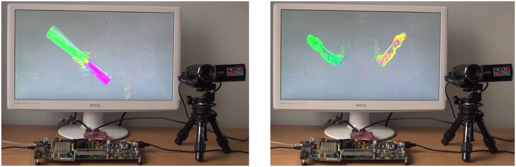 In Figure 13 two sample images of the system described in this section working on VC707 evaluation board are presented. A camera with HDMI output is a video stream source, which is processed by the FPGA board. The computed optical flow is coloured and displayed on a LCD monitor.