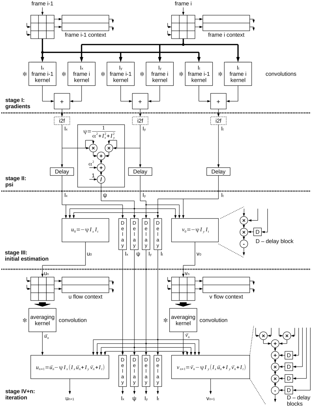 It can, however, be noticed that transition from one iteration of Equations (2) and (3) to the other does not require the knowledge of the results for the whole image. A new iteration can be started as soon as enough data from the previous one is available to form a context needed to compute ū, ῡ. It should also be observed that values of derivatives Ix, Iy, It needs to be determined only at the beginning and are identical in each iteration. Because ū, ῡ are usually computed in a 3 × 3 neighbourhood, a classical solution from context filtering [31], requiring only 9 registers and two delay lines can be used.