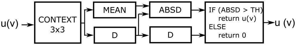 This is a simplification of the standard deviation measure and consumes less hardware resources - it does not require the computation of power and division. Using such criteria is based on the assumption of optical flow local smoothness. In other words, if the flow for a given point is reliable, then the absolute deviation value should be small. If it is large, it is assumed that the algorithm did not computed a proper optical flow value and it should be discarded. The schematic of the proposed module is presented in Figure 4. All computations are carried out in a fully pipelined way. The module returns either the original flow (u, υ) vectors or (0,0) if the deviation is above set threshold. The logic conditions for u and υ vectors are connected with “or” operator.