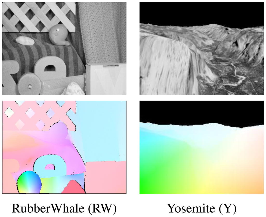 Two sequences Yosemite and Rubber Whale from the Middlebury dataset [9] were used to evaluate the proposed hardware optical flow computation modules (Figure 6). Each sequence consists of two greyscale images and a file with reference ground truth flow values (in Figure 6 presented and coloured according to scheme described in Section 6.1). These sequences contain relative small object motion between frames and therefore are well suited for testing mono-scale optical flow algorithms.