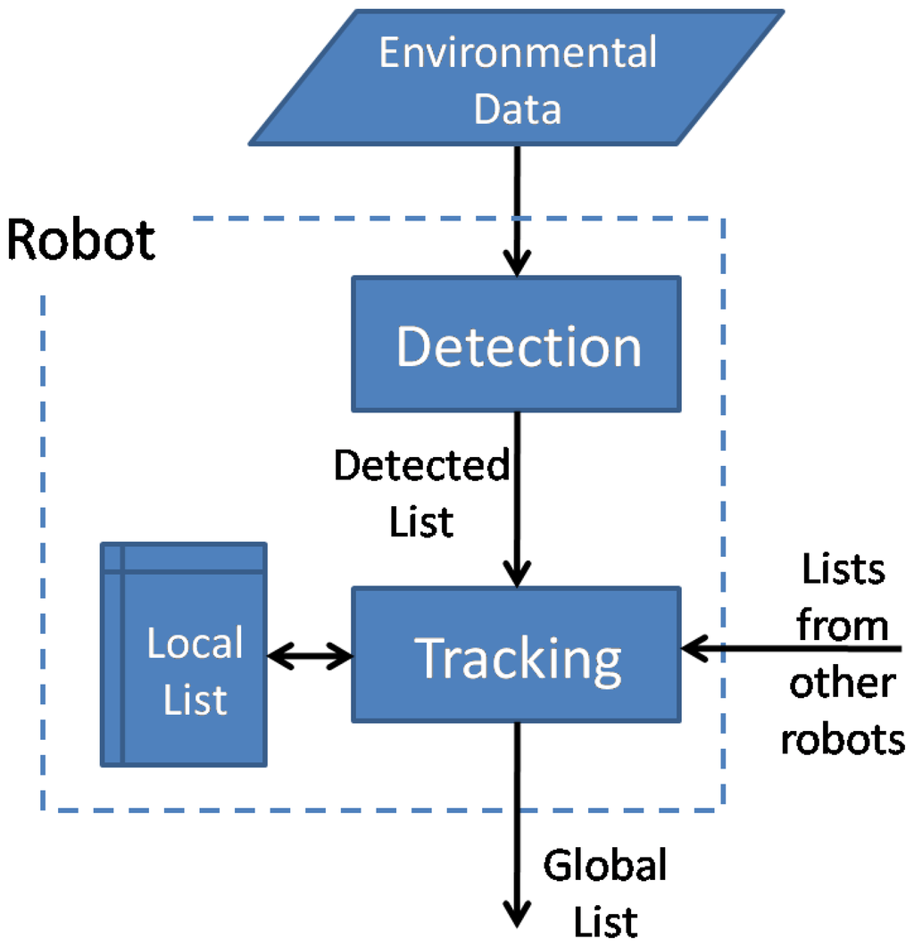 In this section, we propose a tracking procedure that can work with dynamic object data supplied by any kind of detection algorithms complying with the conditions specified in Section 2. Another singularity of the method is that it can also handle and process dynamic object lists provided by other robots or sensors working in the same surveillance area.