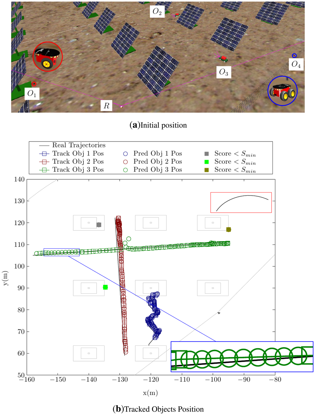 Figure 10b shows the tracked positions for the detected objects. In this drawing, the ground layout of the solar panels is plotted for clarity, although the detecting robot did not have this information during the test. The detected trajectories plotted in this figure demonstrate that three out of four objects in the scene are perfectly detected, along with a couple of miss-detections located in the base of some of the solar panels. The fourth object is a simulated Pioneer-3AT robot (0.5 × 0.5 × 0.3 m) located about 50–60 m from the detector robot. This object, following the trajectory marked with a red rectangle in the figure, has not been detected. This failure in the detection is not due to the performance of the algorithm, but stems from the small size of the object and its long distance (i.e., more than 60 m) from the detecting robot. Under these conditions, only very few laser beams impact the object, making it impossible to discern between its movement and noise-induced changes in the laser measurements.