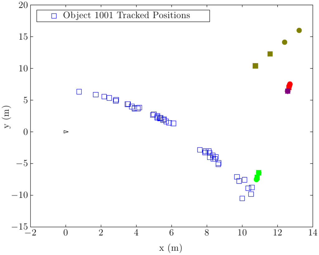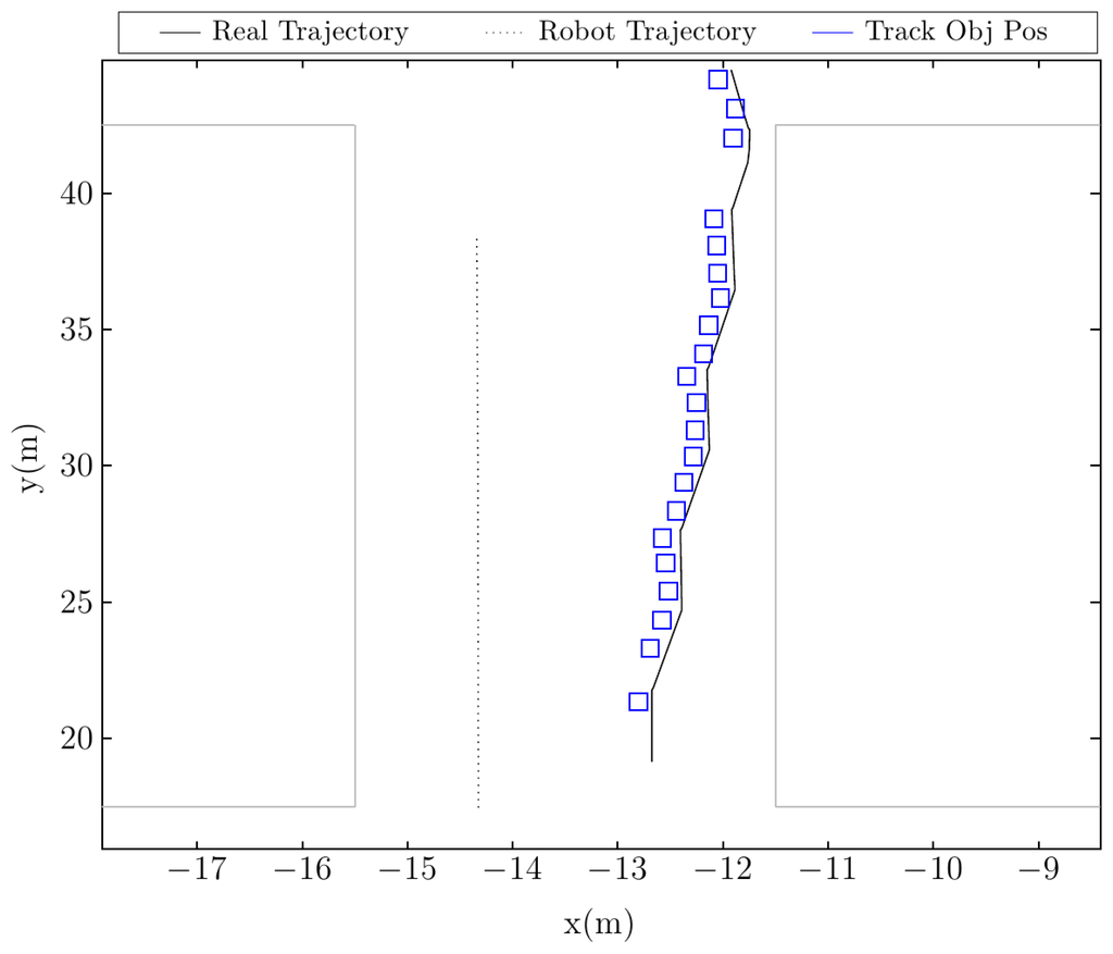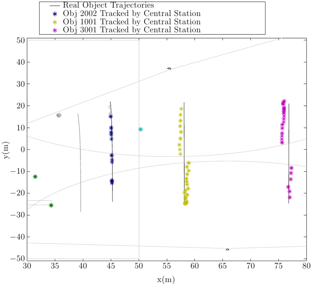 The output of the tracking module for this test can be seen in Figure 18b. The two object trajectories are clearly visible, and the tracking algorithm identifies the objects correctly, even after object 1002 changes its direction at some moment during the test.