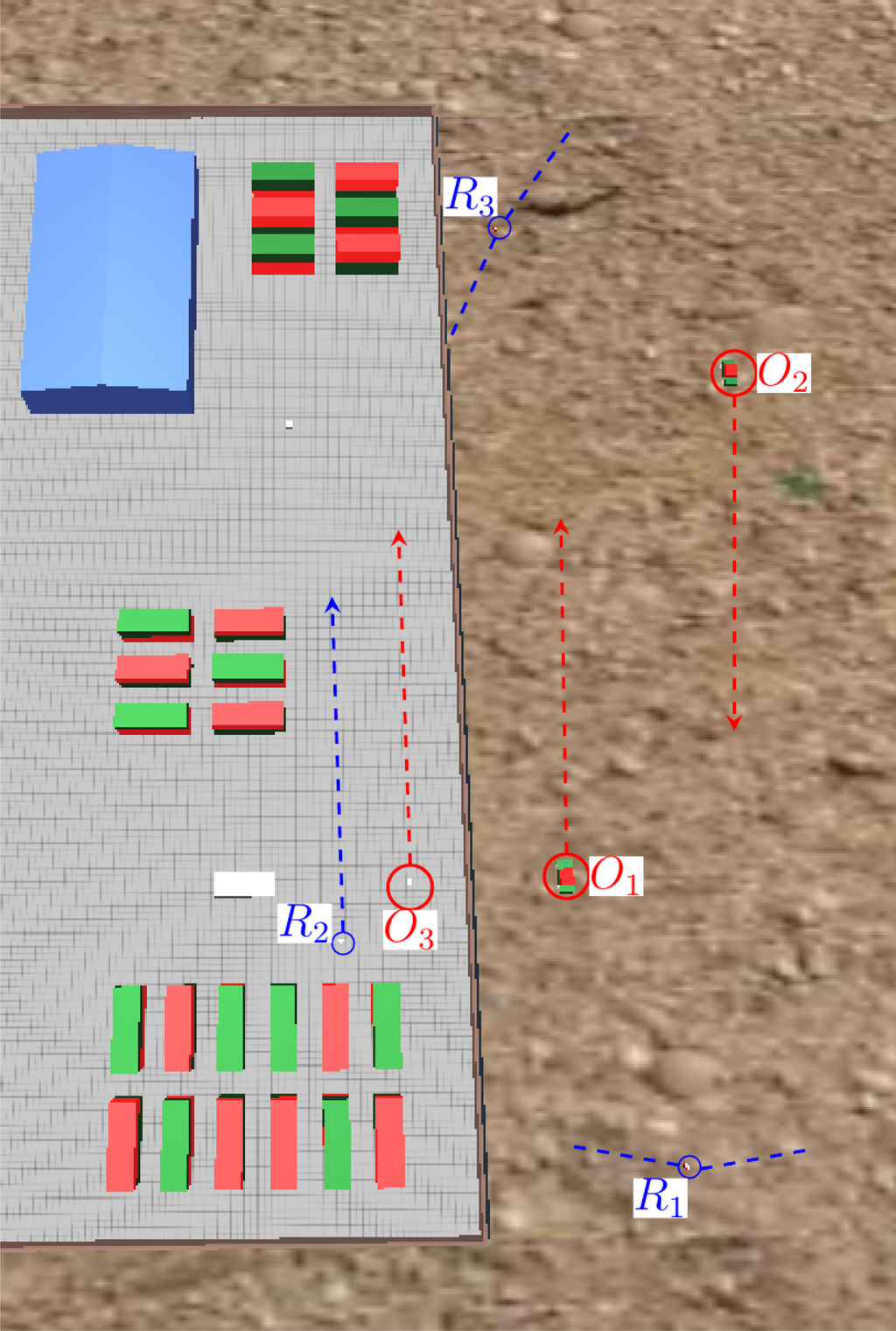 Not just obstacles can be used to conceal possible intruders. Buildings can also be good hiding places for intruders moving along the walls to avoid detection. Figure 11 shows the initial position of the elements in a simulation in which a robot tracks a dynamic object between two walls. This situation could also represent a robot making a surveillance patrol between shelves in a storage area or between rows of containers in a harbor docking area.