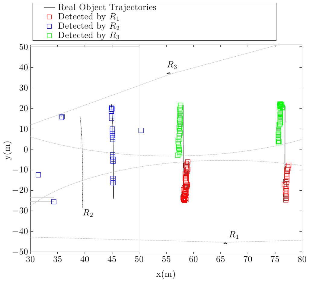 Figure 14 shows the object positions detected by each surveillance robot. The contour lines of the static elements in the simulation, as well as the range of detection limits for the static robots are marked in the same plot for visualization purposes. It is important to notice that the robots have no information about static objects in the environment. All three robots detect the dynamic objects that are moving in their respective detection ranges. The dynamic robot, R2, is the only one that produces some detection errors. These errors appear mainly at obstacle corners, where the gradient conditions do not perform well in ruling those obstacles out. However, the tracking algorithms eliminate these miss-detections.