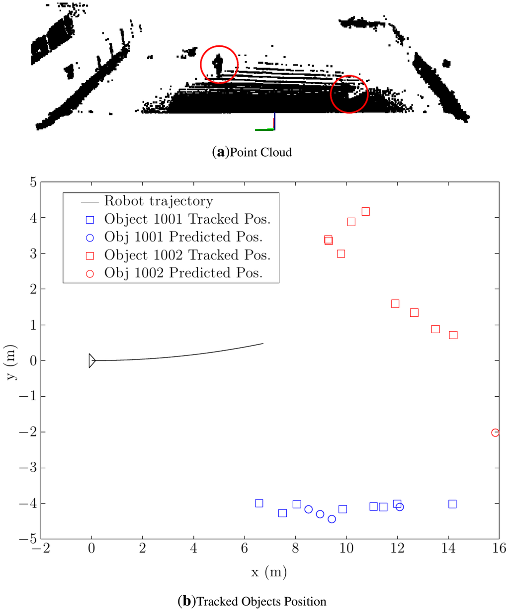 Of course, when the robot is moving, its ability to detect and track moving objects must remain intact, and therefore, the dynamic detection algorithm must be also tested with real data. To illustrate its performance, the dynamic detection algorithm was tested in an exterior environment with two objects (i.e., persons in this test) moving in the detection range of the robot. A point cloud of the position of the elements at a half period test can be seen in Figure 18a.