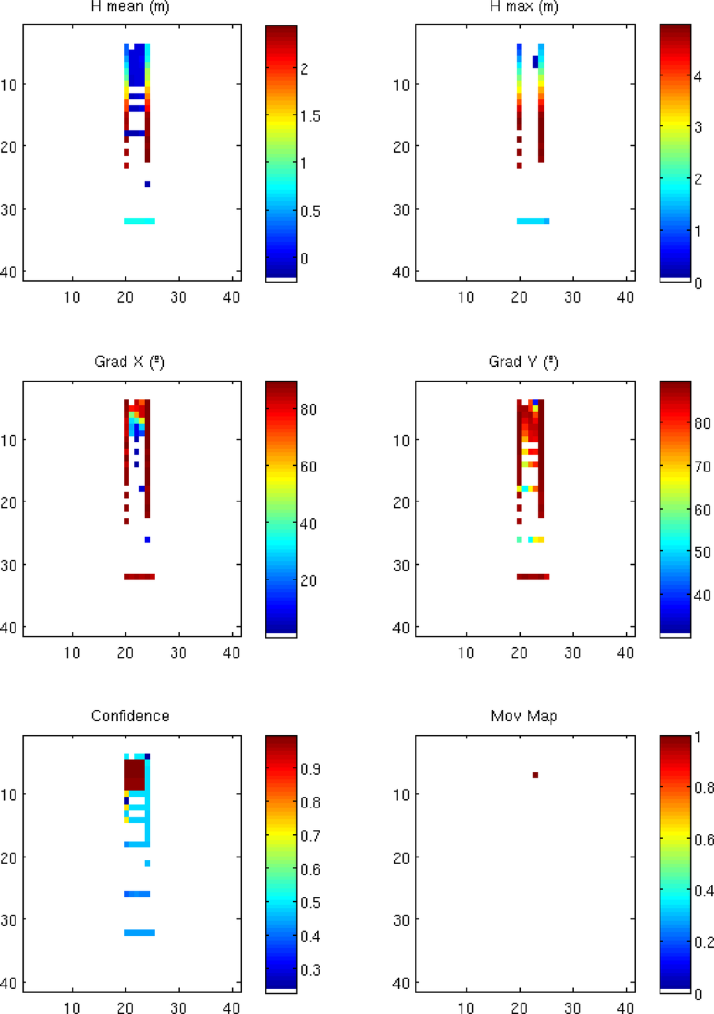 Gradient layers: These are used to estimate the slopes of the terrain. Gradients are calculated along fixed axes using only the collision points within the same cell. This parameter is used to discard static elements, such as walls, fences, etc. When a robot comes closer to one of these elements, the maximum height of the cell can be increased, although the gradient in the cell remains constant, thus discarding the designation of such cells as dynamic objects.