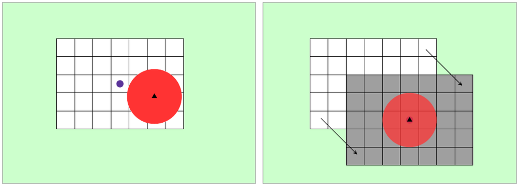 Since, in this case, the processed measurements come from a sensor mounted in a moving robot, the change in the robot coordinate frame has to be taken into account. One option would be to keep increasing the map size as long as the robot moves. With this approach, the computational processing cost increases with the dimension of the map. The second approach consists of changing the map center in the global coordinate frame each time that the range of the sensor reaches the limit of the map.