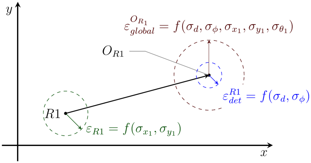 The variances of the detected position for dynamic objects can be calculated with respect to the variances in the distance measurements and the variances of the detecting robots' positions. As a result of this calculation, one obtains the position variances defined by Equation (13), where zd and zϕ are the distance and relative angle to the object and σd and σϕ the variances of the corresponding measurements.
