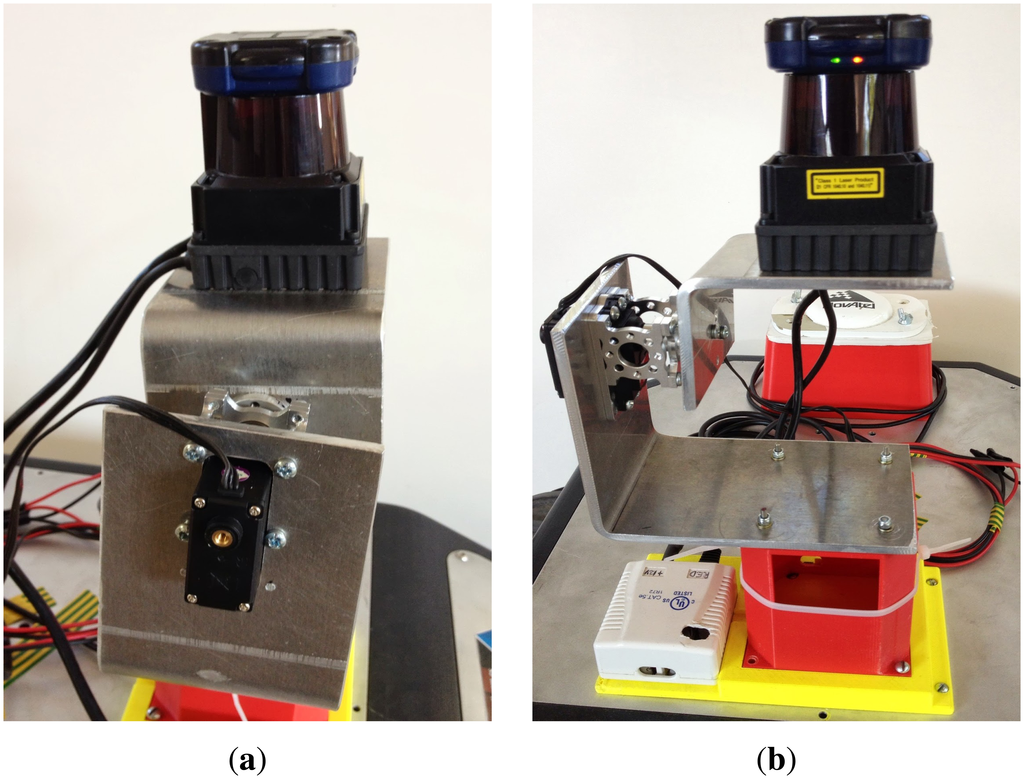 On the other hand, Section 4.2 describes some tests carried out by using a Summit–XL robotic platform equipped with a Hokuyo UTM-30LX range finder mounted on a tilt unit in a real scenario. This combination can be appreciated in Figure 9. The main drawback of this combination is that it has a lower frequency than a real 3D LiDAR, such as, for example, the Velodyne HDL-64E. This results in a lower velocity range for the detected objects. However, for the purposes of algorithm validation, the used sensor turned out to be fast enough.