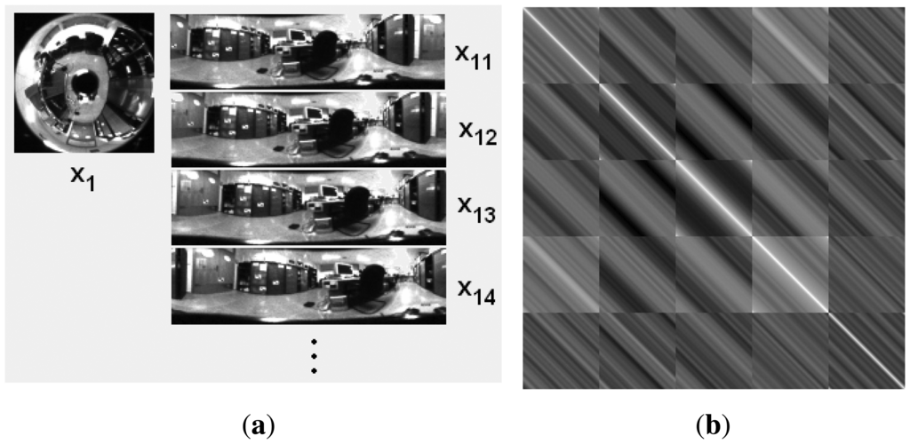 Figure 1a shows the different versions of a panoramic scene artificially generated to build the data matrix to perform PCA analysis with rotations and (b) the inner product C corresponding to a set of images from n = 5 locations and N = 128 rotations per location. We can express then: