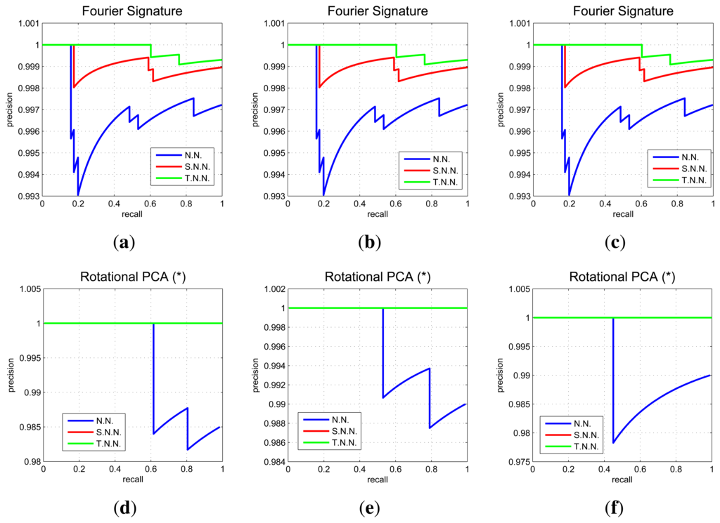 As far as occlusions are concerned, the precision clearly decreases when the percentage of occlusions increases. However, HOG and gist present the most stable behavior. In the presence of noise, PCA with rotations is able to cope with it as there is no appreciable change in precision. Fourier Signature also presents good results against Gaussian noise.