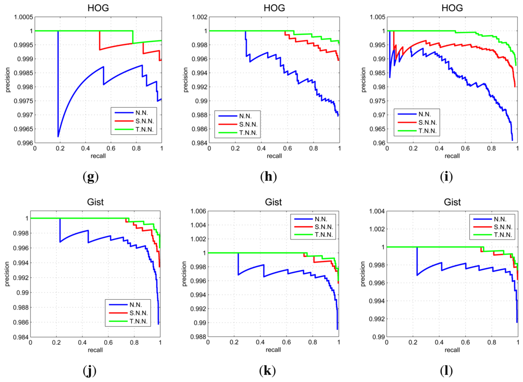 In Figure 10 we show some relevant graphs obtained using the COLD database. Each graph shows three recall and precision curves. To draw the first curve (NN) we consider that a test image is correctly classified if the nearest neighbor in the map is closer than 10 cm to the point where the test image was captured. The second curve (SNN) is drawn considering a correct classification when the nearest neighbor or the second nearest neighbor is within this threshold, and the third curve (TNN) considers a correct classification when the first or the second or the third nearest neighbor is within this 10 cm threshold. This way, the first curve is the most restrictive one. The second and the third curves also consider a good classification when the second or the third neighbor are geometrically close to the test images.