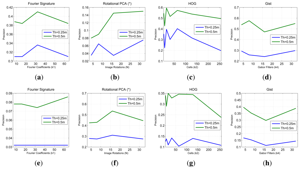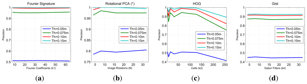 In Figure 11 we sum up the information from all the image retrieval experiments we have carried out. These charts present the final result of precision (expressed in parts per unit) for each experiment versus the main parameters of the descriptors. To analyze a generic situation, we have defined four different geometric thresholds around the point where the test image was captured. In general, FS and gist present a constant precision independently on the parameter of the descriptor, although FS presents a slightly better behavior. HOG presents as good localization results as FS when we use an intermediate number of cells (k2). PCA presents the best localization results (when using a limited database of 200 images).